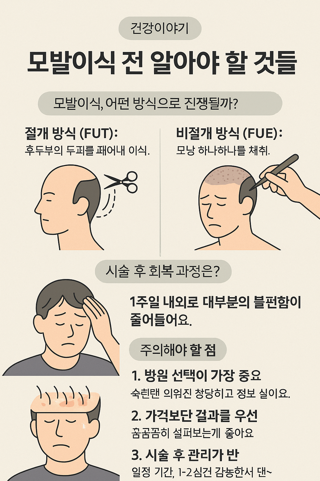- 비절개 방식: 모낭 하나하나를 채취. 흉터가 적고 자연스러움